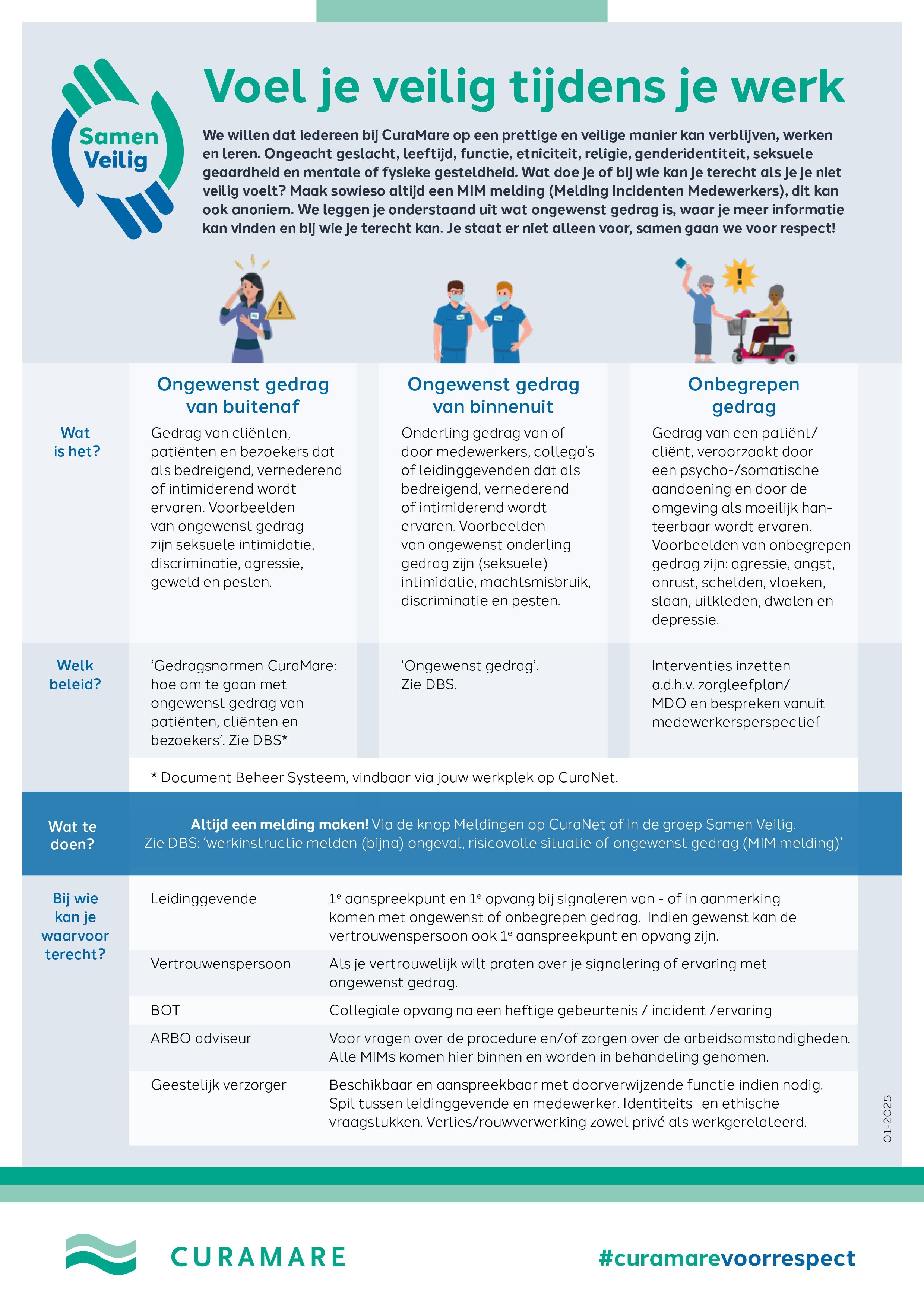 Met het document Samen Veilig bracht de organisatie alle bestaande regelingen, protocollen en procedures onder één herkenbare kapstok. Drie vormen van ongewenst gedrag zijn helder uitgewerkt en gekoppeld aan concrete handelingsperspectieven. De aanpak is het startpunt van een tweejarig programma onder de noemer #curamarevoorrespect, met eerst bewustwording en daarna gedragsverandering.