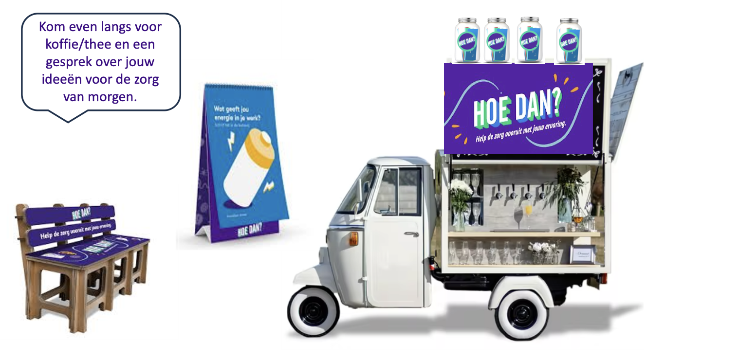 De Hoe Dan?-coffee corner is een gezellige hoek waar medewerkers tijdens het event terecht kunnen voor verse koffie/ thee en een gesprek over hun werk, hoe het anders kan en de toekomst van de zorg kunnen hebben.
