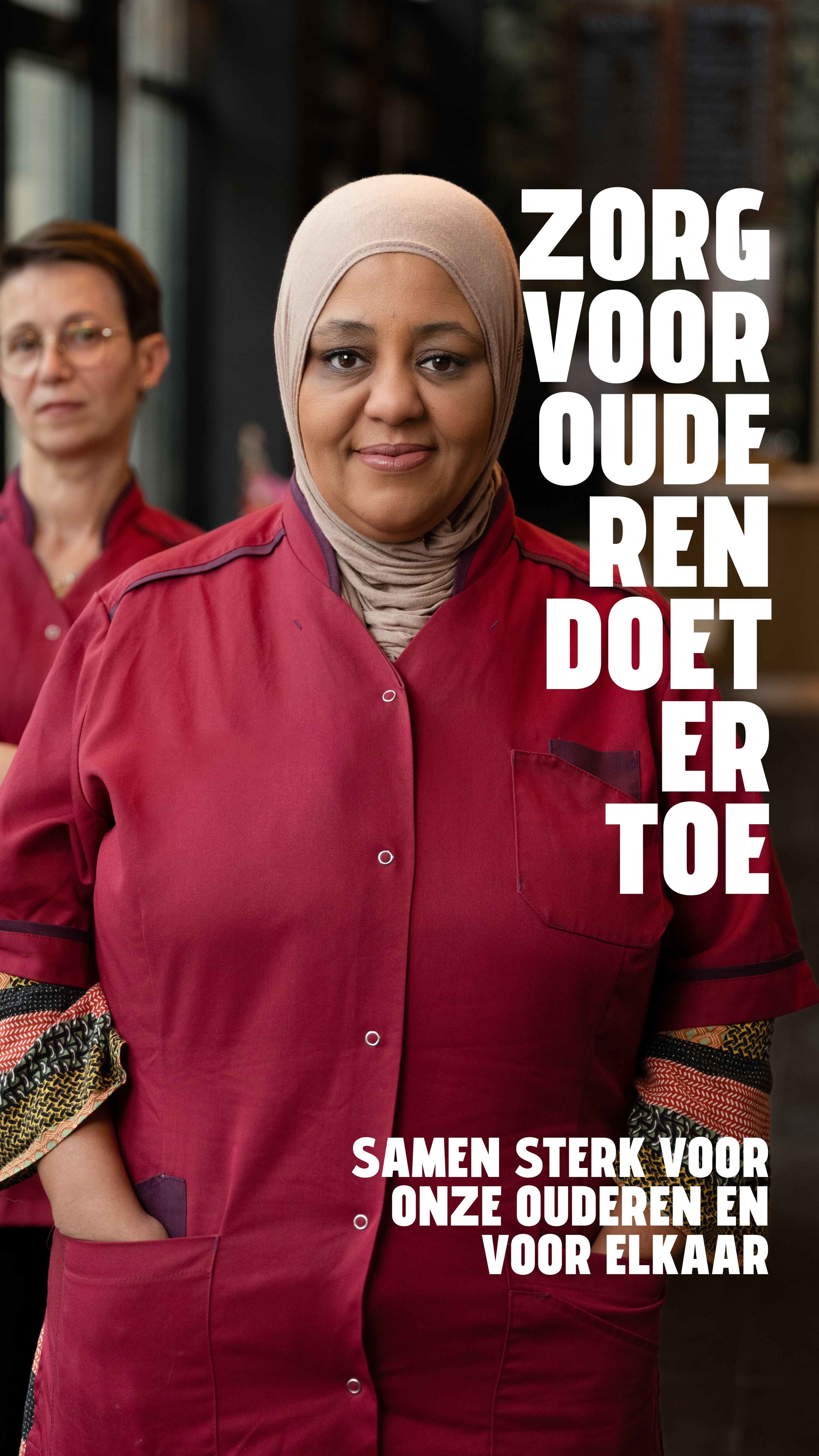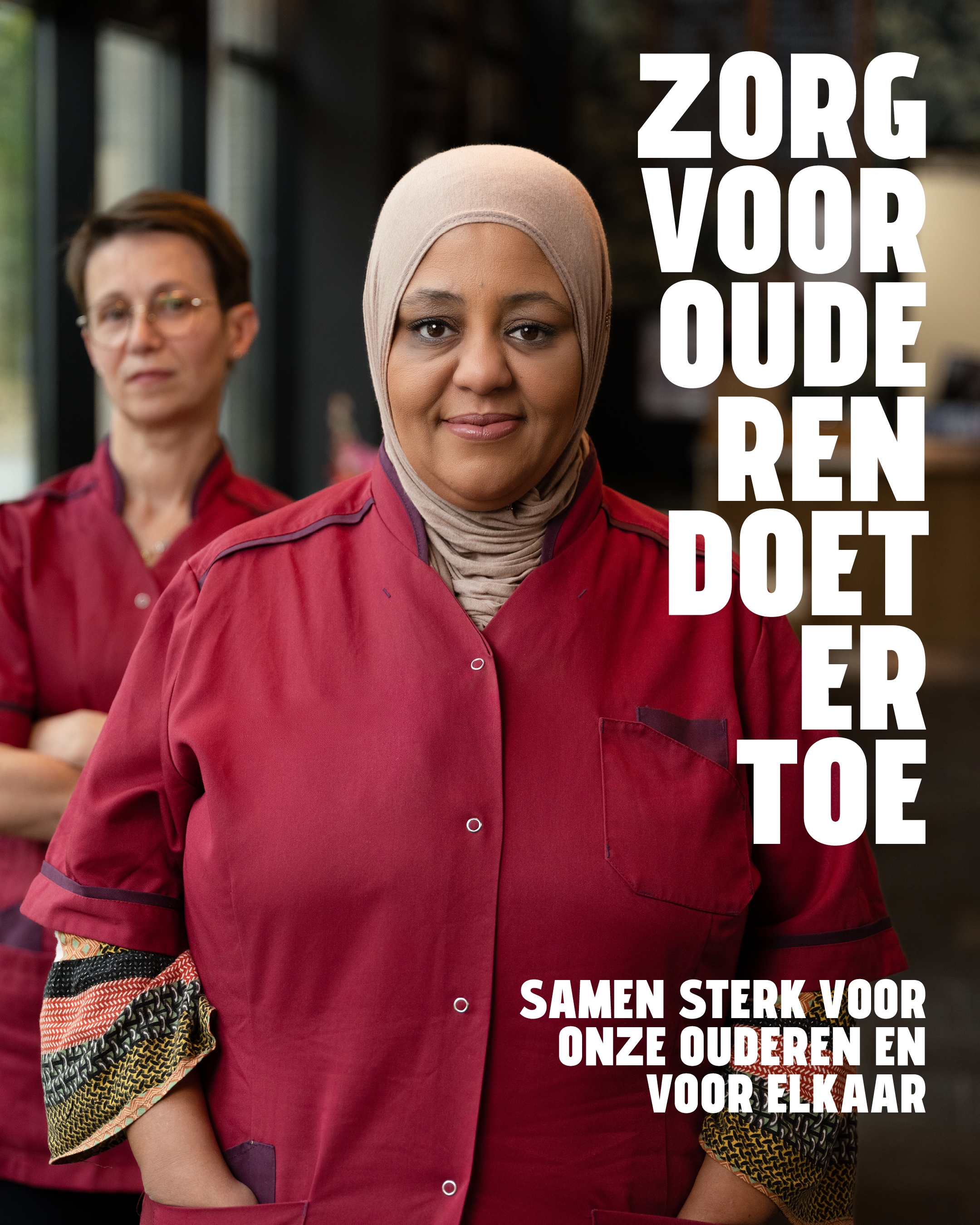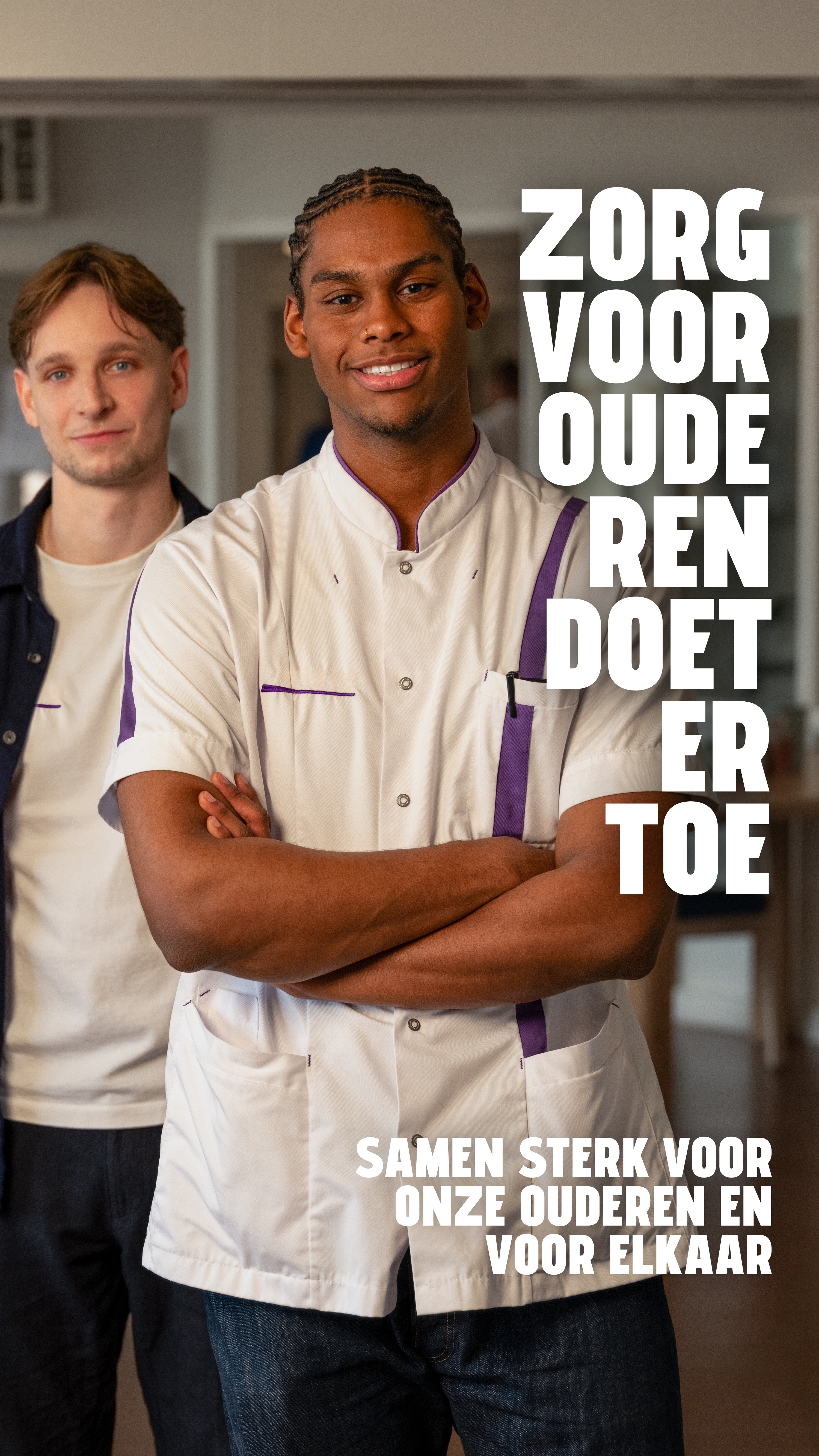 Hieronder de 3 campagneposters. Ze zijn te zien in het hele land, van 24 november tot en met 31 december 2025 als posters bij bushaltes (abri's) en ook op digitale schermen. Zorgorganisaties kunnen deze posters in andere formaten downloaden. Op de posters zijn medewerkers te zien die ook meewerkten aan de campagne video.